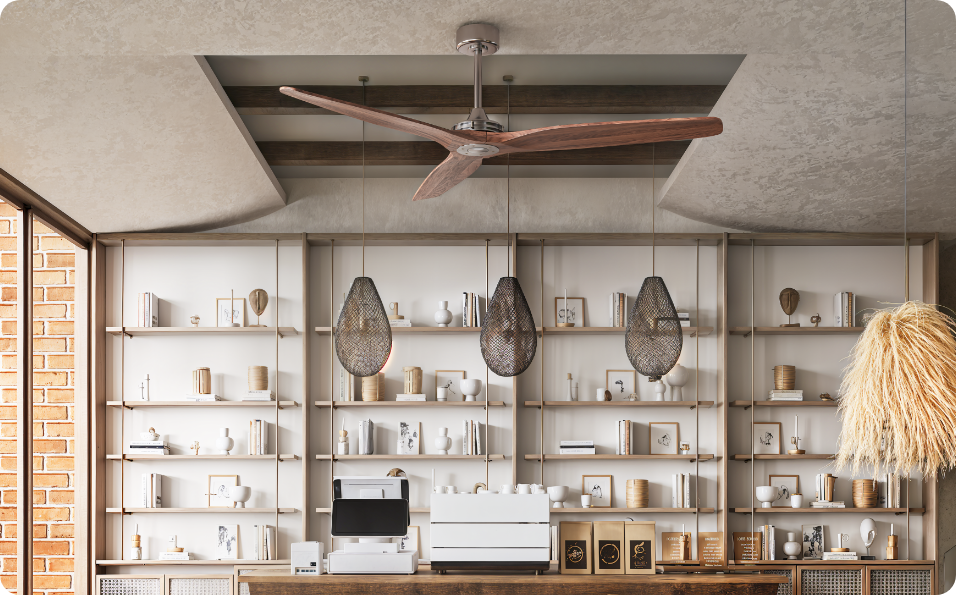 Con seis velocidades ajustables y función de inversión de giro, Boreas permite refrescar en verano y redistribuir el aire caliente en invierno, mejorando la eficiencia energética del espacio. Su estilo sobrio y materiales de alta calidad lo convierten en la elección perfecta para hogares, hoteles, oficinas o entornos comerciales que buscan ventilación con estilo.